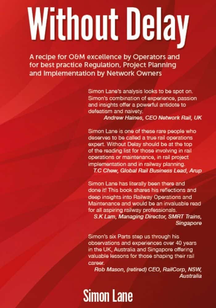 • Simon Lane’s new book Without Delay describes how theory about O&M excellence is turned into practice from a Line Manager’s perspective as someone who successfully reshaped customer service in the rail industry on three continents.  It will make essential reading for any manager in the sector, be they an infrastructure controller or an operator…Graham Eccles: A 45 year Senior Leader in UK Rail Industry